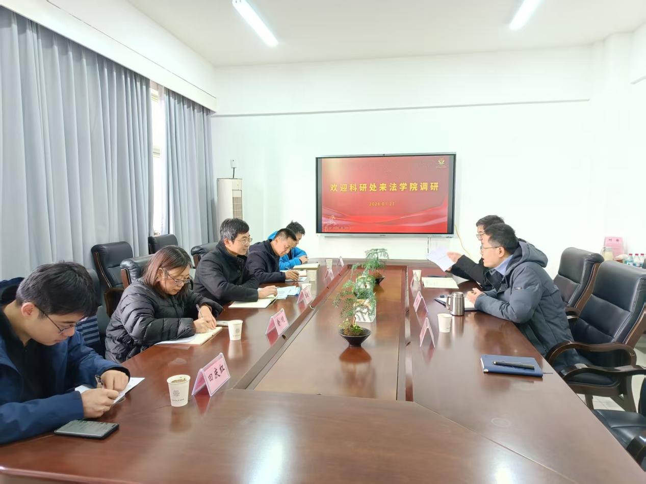 1月21日上午,校科研处王建明处长率队来我院调研。调研座谈会上,唐勇院长首先对科研处一行的到访表示热烈欢迎,并对科研处长期以来对法学院工作的支持表示感谢。他围绕法学院近几年的国社科立项情况、科研整体发展态势进行了说明,并分析了学院在论文发表、课题申报、社科成果奖申报等科研方面仍存在的问题。李海龙副院长介绍了学院在2026年国社科申报组织方面的进程与后续安排。王建明处长肯定了我院这些年在科研方面取得的显...