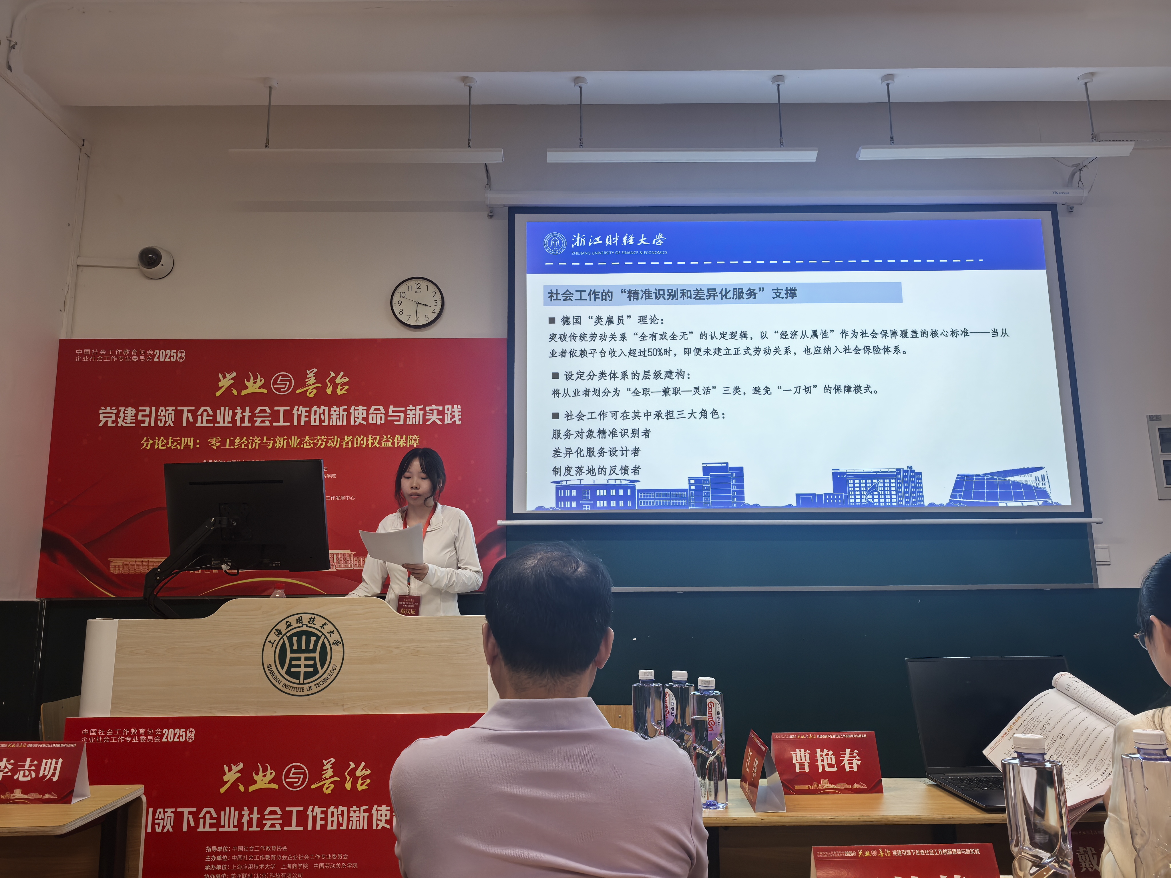 法学院聂玉梅副教授、社会工作系学生温珂(研究生)、郑旖蕾(研究生)入选参与本次论坛的大会发言。温珂同学的论文《企业社会工作服务新就业群体的路径探索--基于生态系统理论》和郑旖蕾同学的论文《平台经济从业者劳动权益保障的社会功能做介入策略》(指导老师:聂玉梅)荣获本次大会“优秀论文”称号。