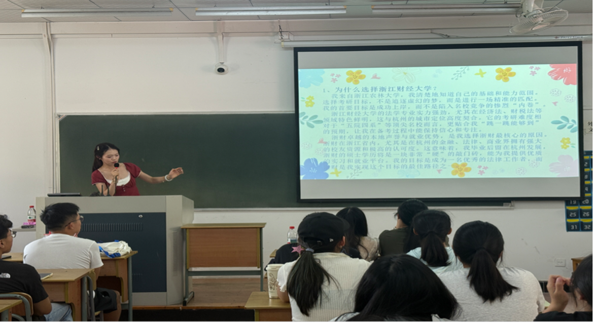 在浙江财经大学东方学院,宣讲团于9月29日下午举办了第三场招生宣讲宣讲活动,现场气氛热烈。洪宇帆同学详细解读了法学院的招生政策、培养特色和就业前景,并分享了自己在法学院的学习体验。在经验分享环节,洪宇帆和梁宇杭同学分别从择校策略和备考方法等角度提供了具体建议,包括如何根据个人发展规划选择适合的研究生方向,以及如何在备考过程中保持良好心态和学习效率。互动环节中,学生们积极提问,问题涉及备考技巧、专业选择、复试准备等多个方面,宣讲团成员逐一给予耐心解答,现场交流充分。