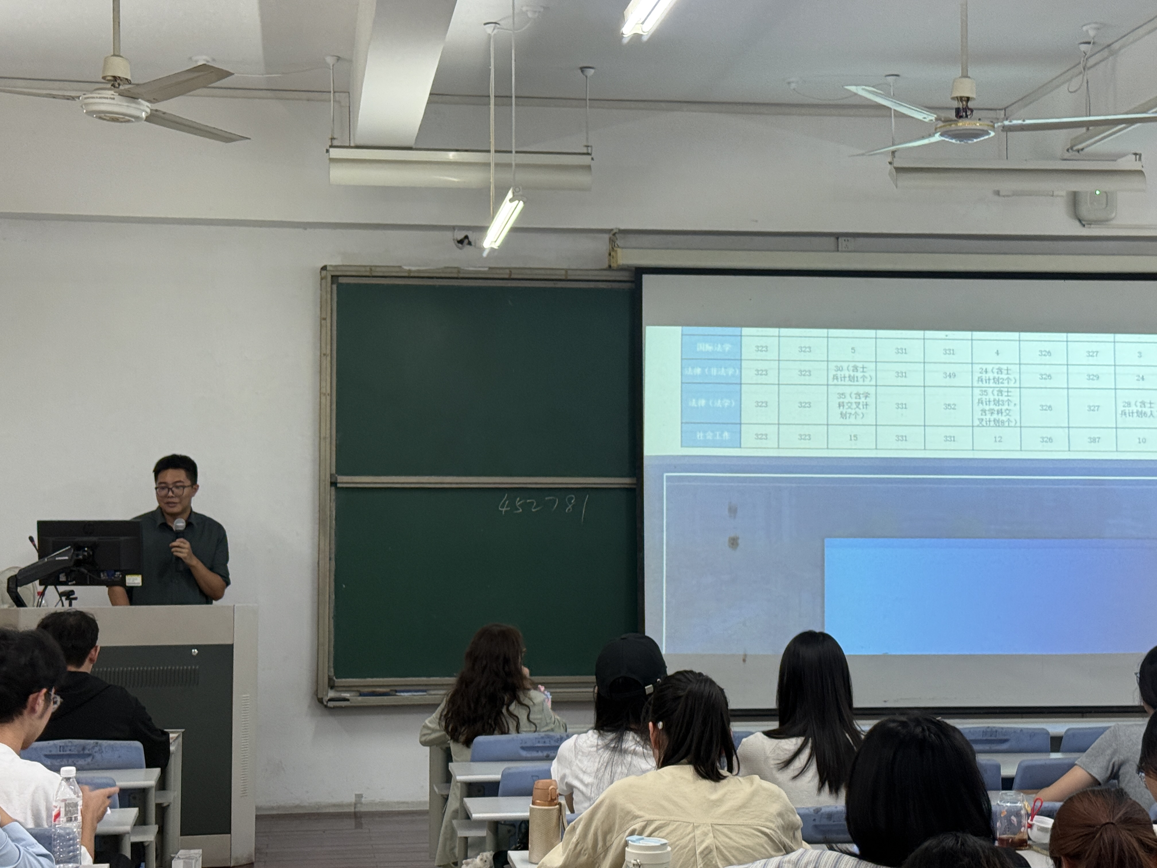 在浙江农林大学,宣讲团于9月25日下午开展了首场招生宣讲活动。本次活动由研究生秘书封海峰老师带队,研会负责人张梦迪、浙江农林大学优秀毕业生夏童同学及在读研究生张宇航同学共同参与。封海峰老师系统介绍了法学院的办学特色、师资力量、学科建设成果及2026年研究生招生政策,并就专业设置、考试科目等具体内容作了详细说明。夏童同学结合自身经历,分享了从浙江农林大学本科毕业到成功考取我院的备考心得与学习体会,为在座学生提供了宝贵的经验参考。在随后的现场咨询环节,宣讲团成员与学生们进行了深入交流,针对报考条件、复习重点等问题给予了细致解答。