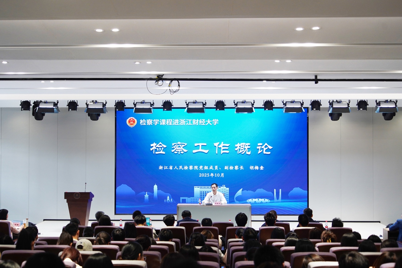 10月23日下午,浙江省人民检察院党组成员、副检察长、一级高级检察官胡梅奎走进校园,为浙江财经大学法学院师生讲授“检察工作概论”。浙江财经大学副校长李占荣出席并主持。
