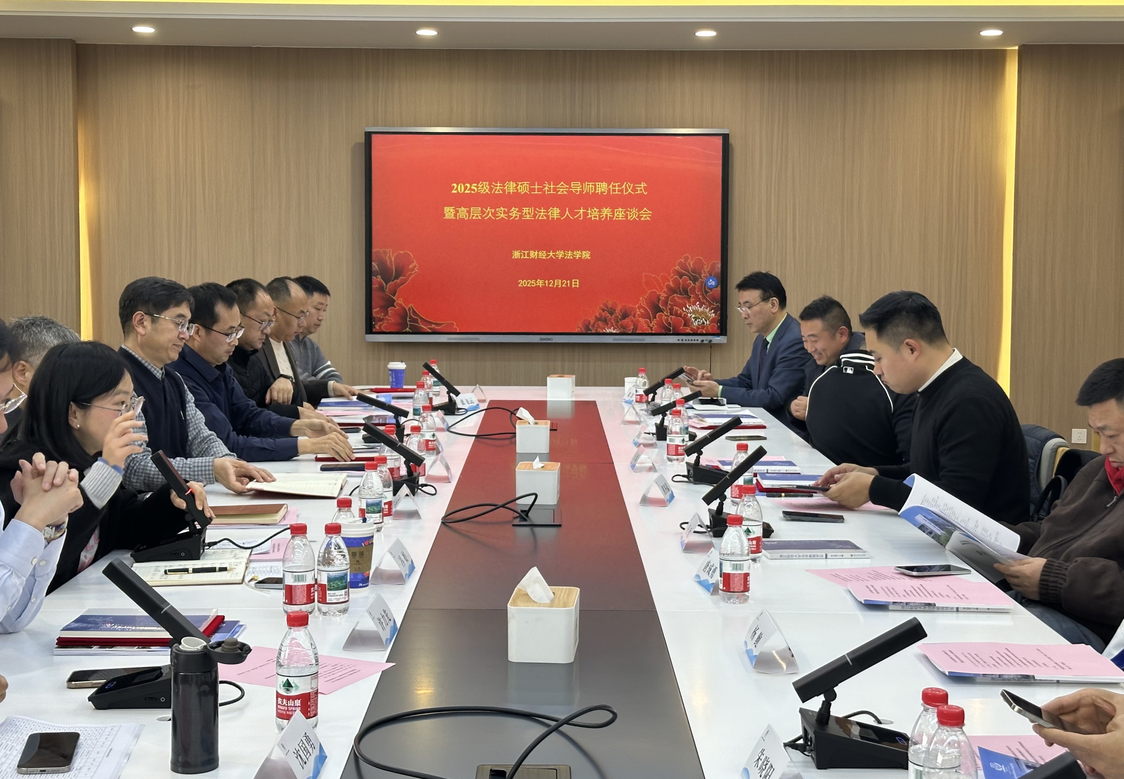2025年12月21日上午,浙江财经大学法学院举办2025级法律硕士社会导师聘任仪式暨高层次实务型法律人才培养座谈会。法学院党委书记丁洪、副院长李海龙、法硕中心主任冯姣等出席会议,来自浙江省嘉善县人民检察院、国浩律师(杭州)事务所、浙江天册律师事务所、浙江京衡律师事务所、浙江六和律师事务所、北京大成(杭州)律师事务所、北京植德(杭州)律师事务所、浙江大才申律师事务所、浙江律匠律师事务所、浙江杭北律师事务所、浙江九玄律师事务所、浙江新台州(杭州)律师事务所、浙江仁谐律师事务所、浙商财产保险股份有限公司、浙江省浙商资产管理股份有限公司等二十余家实务部门的社会导师及2025级法律硕士研究生共同参会。本次会议由冯姣主任主持。