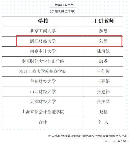 在由中国高校财经慕课联盟主办、上海对外经贸大学承办的第三届全国财经高校“同课异构”教学竞赛“经济法”课程竞赛中,我院经济法系刘静老师获竞赛三等奖。