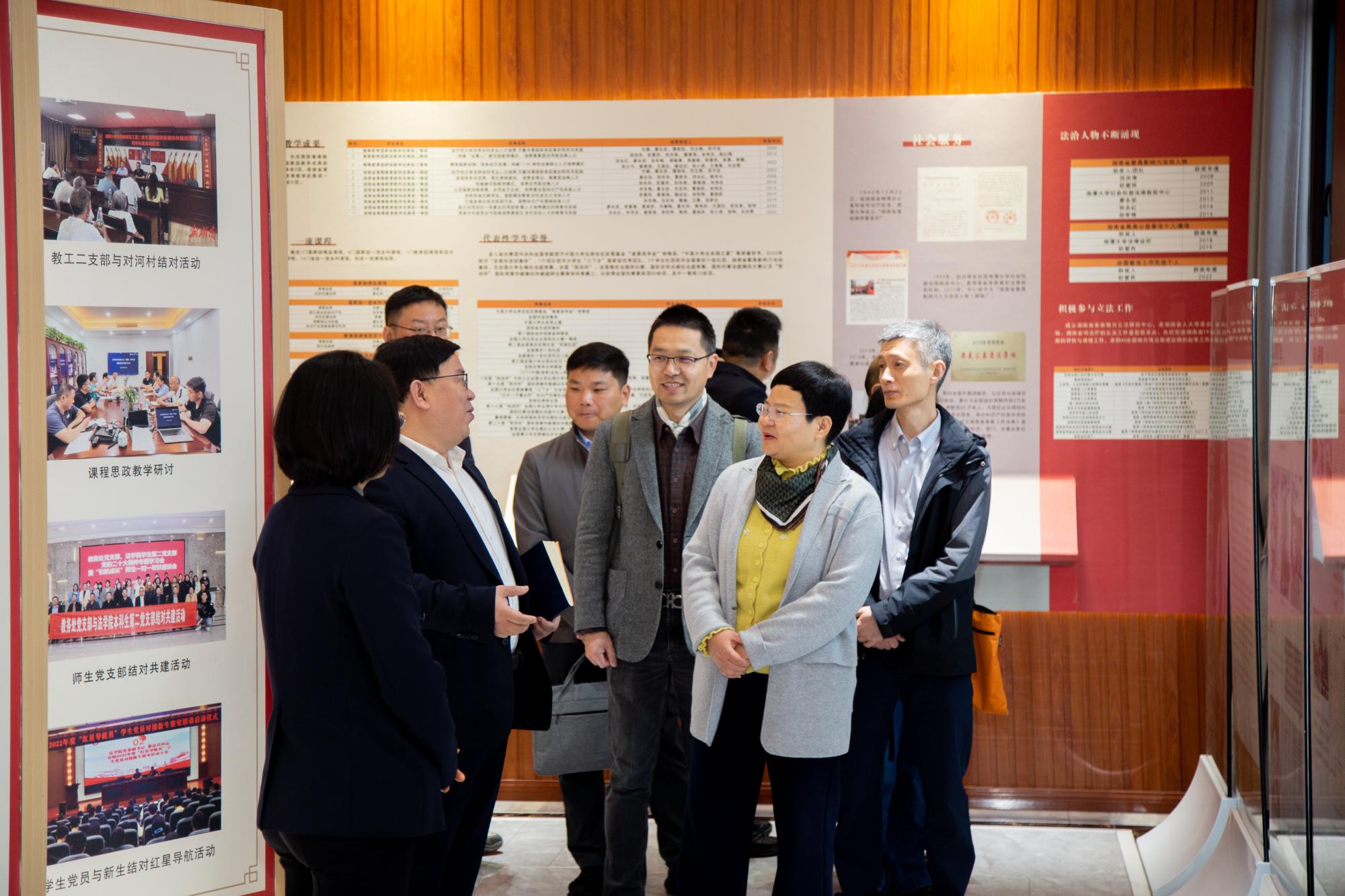 在法学学部部长李仕春陪同下,调研团队参观了法学学部院史馆,了解湘潭大学法学学科建设历程以及在人才培养、法治建设方面的贡献等。