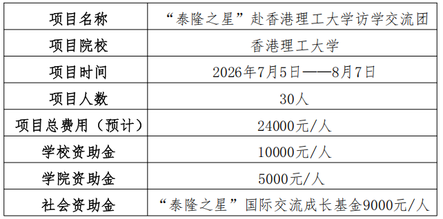 备注:①本次项目总费用预计24000元(包括项目费用、交通费用、签证费用、保险及部分餐食补贴),由学校资助+学院资助+社会资助组成,其他学生自行消费部分由学生本人承担。②香港理工大学访学项目介绍详见国际交流合作处项目介绍https://mp.weixin.qq.com/s/4HA7chS63hMEIhlFDe2aMg。