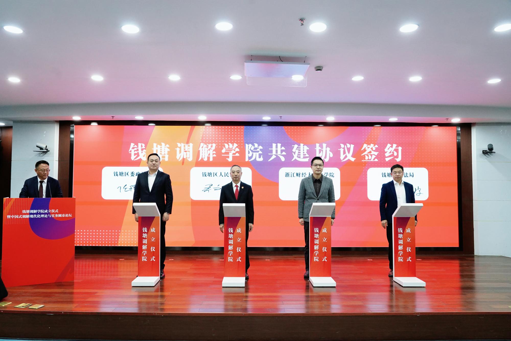 活动现场,钱塘区委政法委常务副书记任建国、钱塘区人民法院党组成员、副院长吴文峰、钱塘区司法局副局长(主持工作)许宏波、浙江财经大学法学院院长唐勇一起签署钱塘调解学院共建协议。
