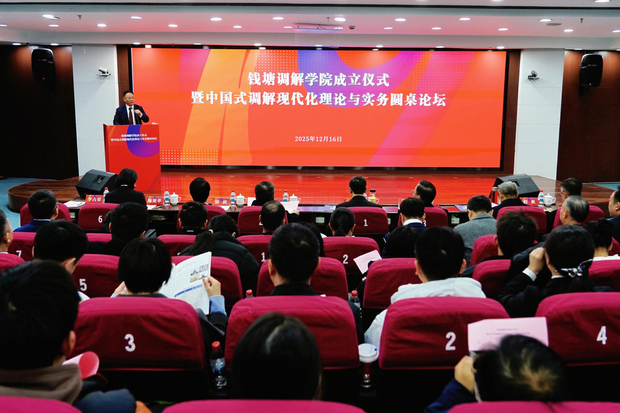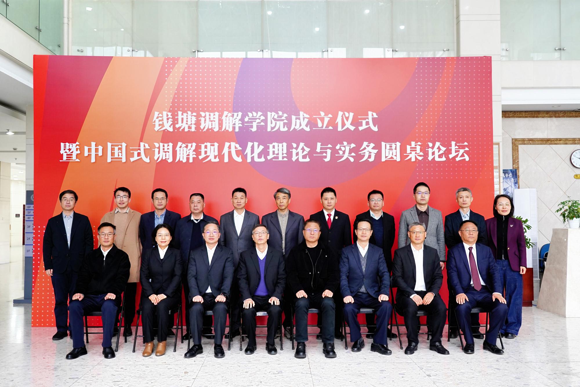 12月16日,钱塘调解学院成立仪式暨中国式调解现代化理论与实务圆桌论坛在我校举行。杭州市中级人民法院党组书记、院长唐学兵,浙江财经大学党委书记、校长魏江,钱塘新区党工委书记、钱塘区委书记沈燕俊出席并致辞。杭州市司法局党委书记、局长徐前,浙江财经大学副校长李占荣,浙江财经大学党委副书记、统战部部长程爽,钱塘区委常委、组织部部长李丰,钱塘区人民法院党组书记、院长施迎华出席。仪式由副校长李占荣主持,钱塘区各相关部门、街道、司法所、各街道人民调解委员会、各行业性专业性人民调解委员会负责人,调解领域专家学者,校友律师代表,媒体代表以及法学院教师和学生代表等120余人参加活动。