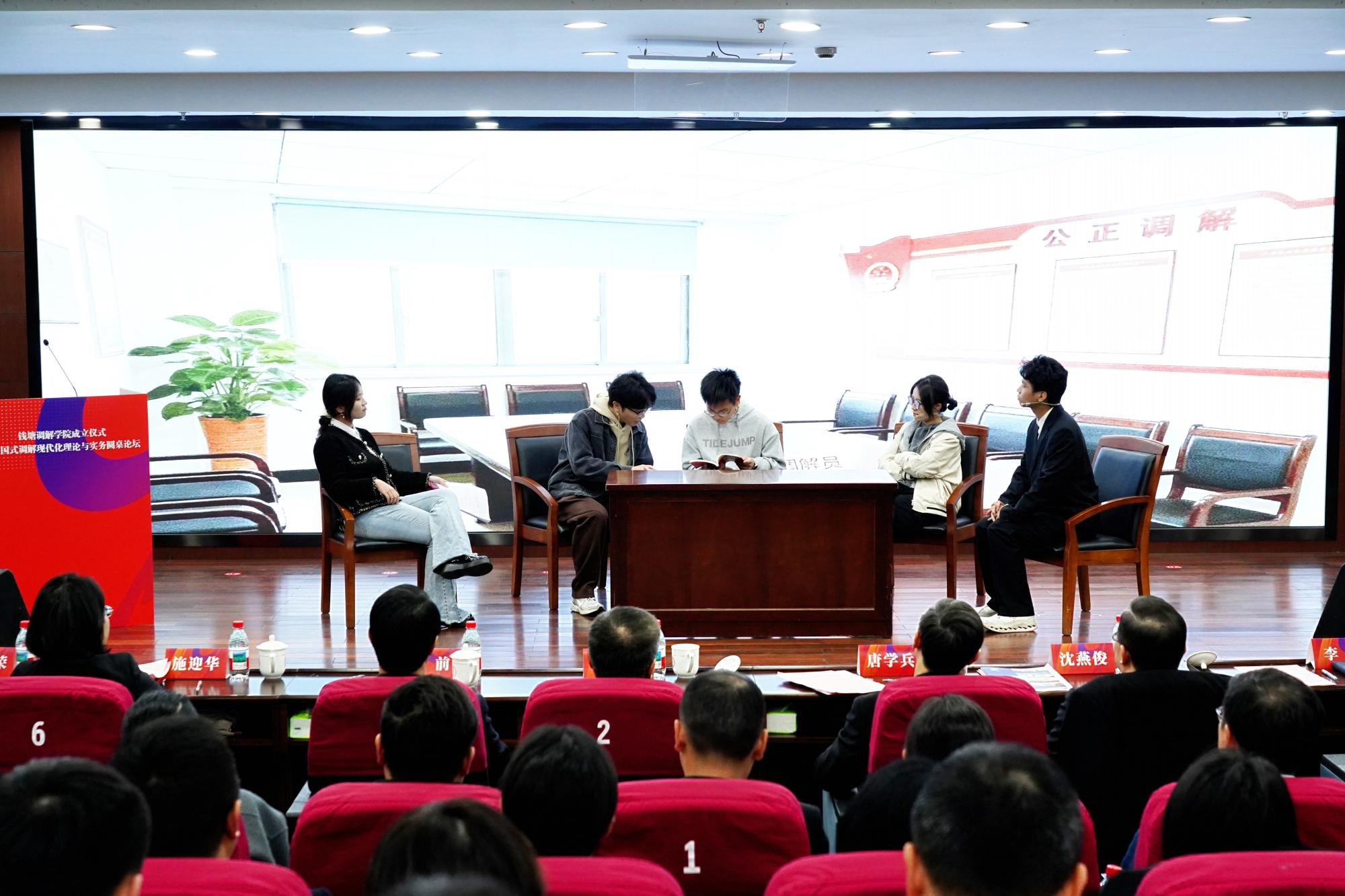 法学院学生演绎了《钱塘速度,调解有度:综治中心的“心”服务》情景剧,生动展现了人民调解、商事调解与钱塘调解学院共同推动基层矛盾纠纷化解的新场景。