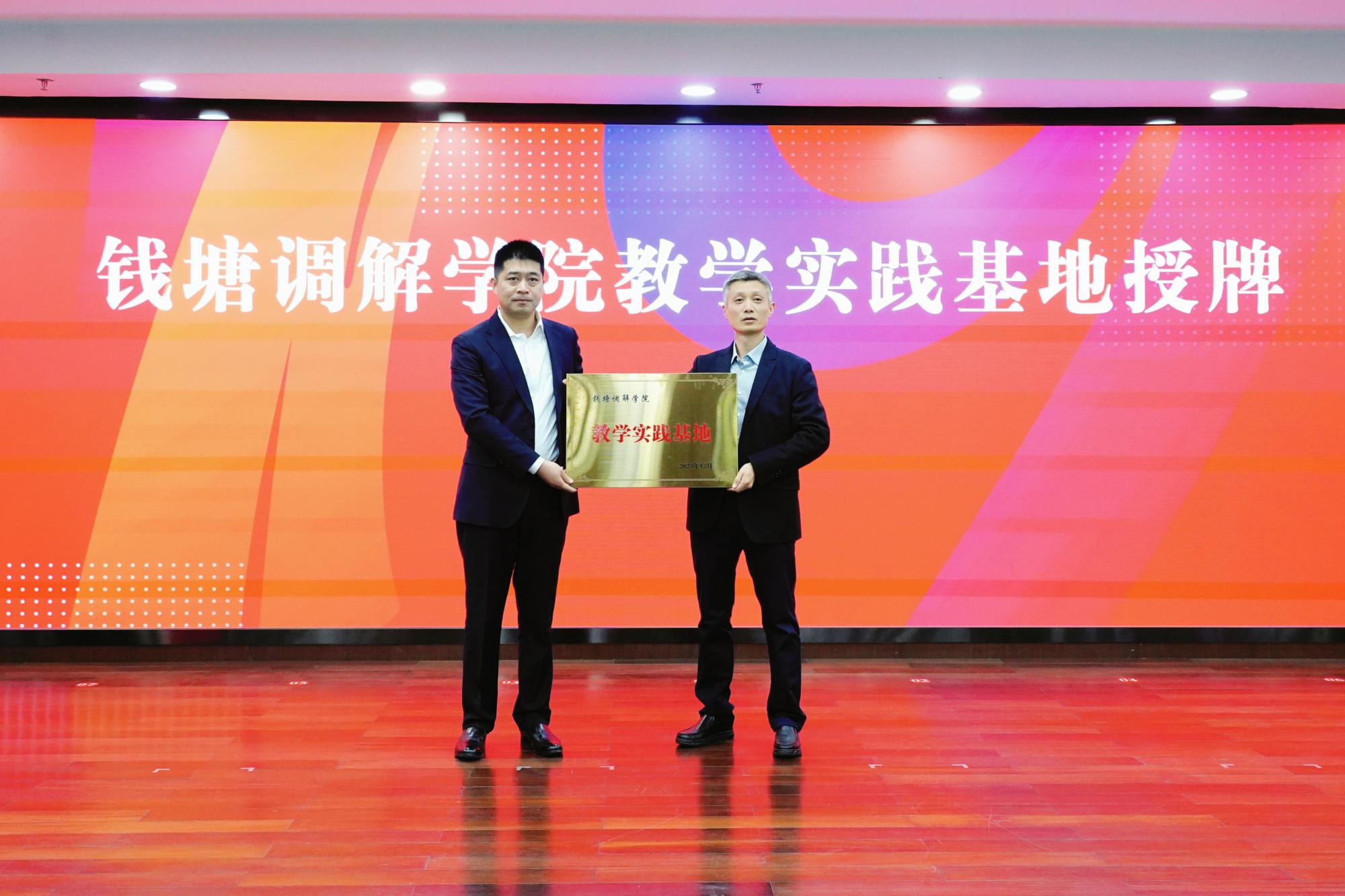 法学院党委书记丁洪向钱塘区社会治理中心(综治中心)副主任诸士楷授牌钱塘调解学院教学实践基地。