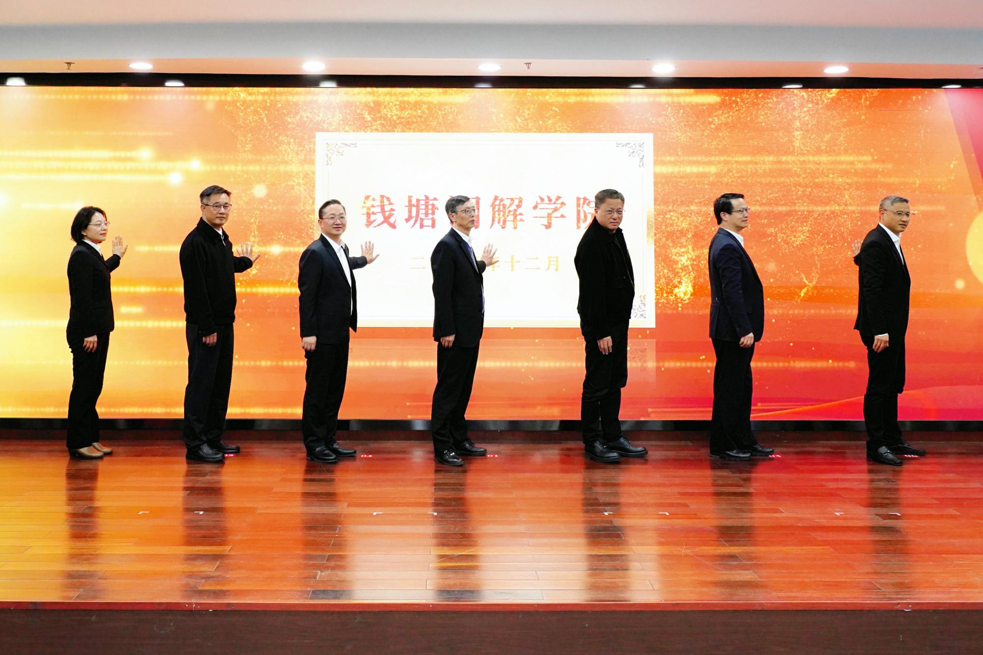 唐学兵、魏江、沈燕俊、徐前、程爽、李丰、施迎华共同为钱塘调解学院揭牌。