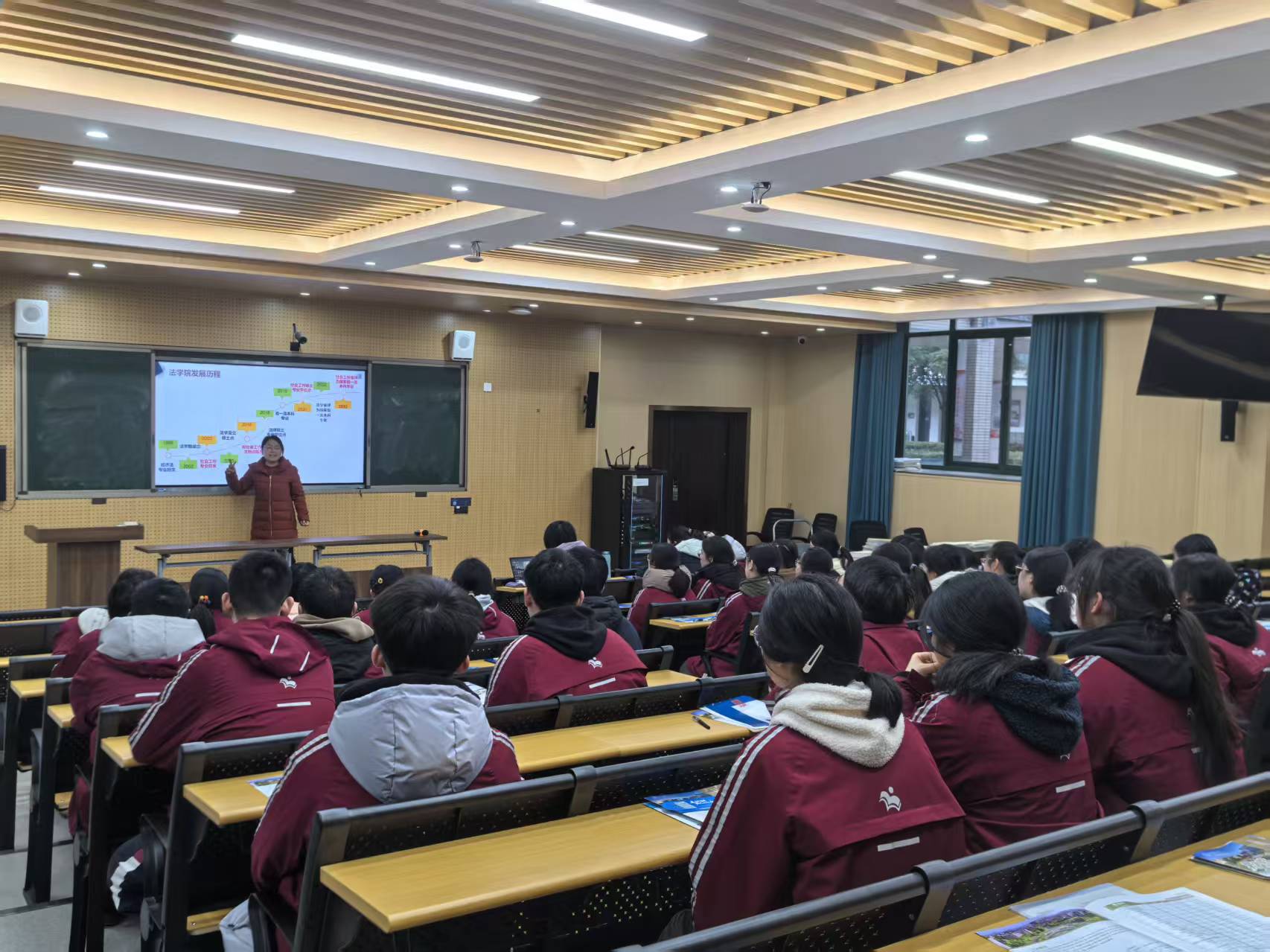 王春霞和马路瑶老师结合个人求学与教研经历,围绕“大学教育的意义”“专业选择与职业发展路径”等话题,与同学们展开深入交流。她们系统介绍了法学及社工学科的特点和社会应用场景,引导学生理性看待专业选择,并就转专业、学业压力应对等实际问题提出建议。现场互动积极,学生反响热烈。