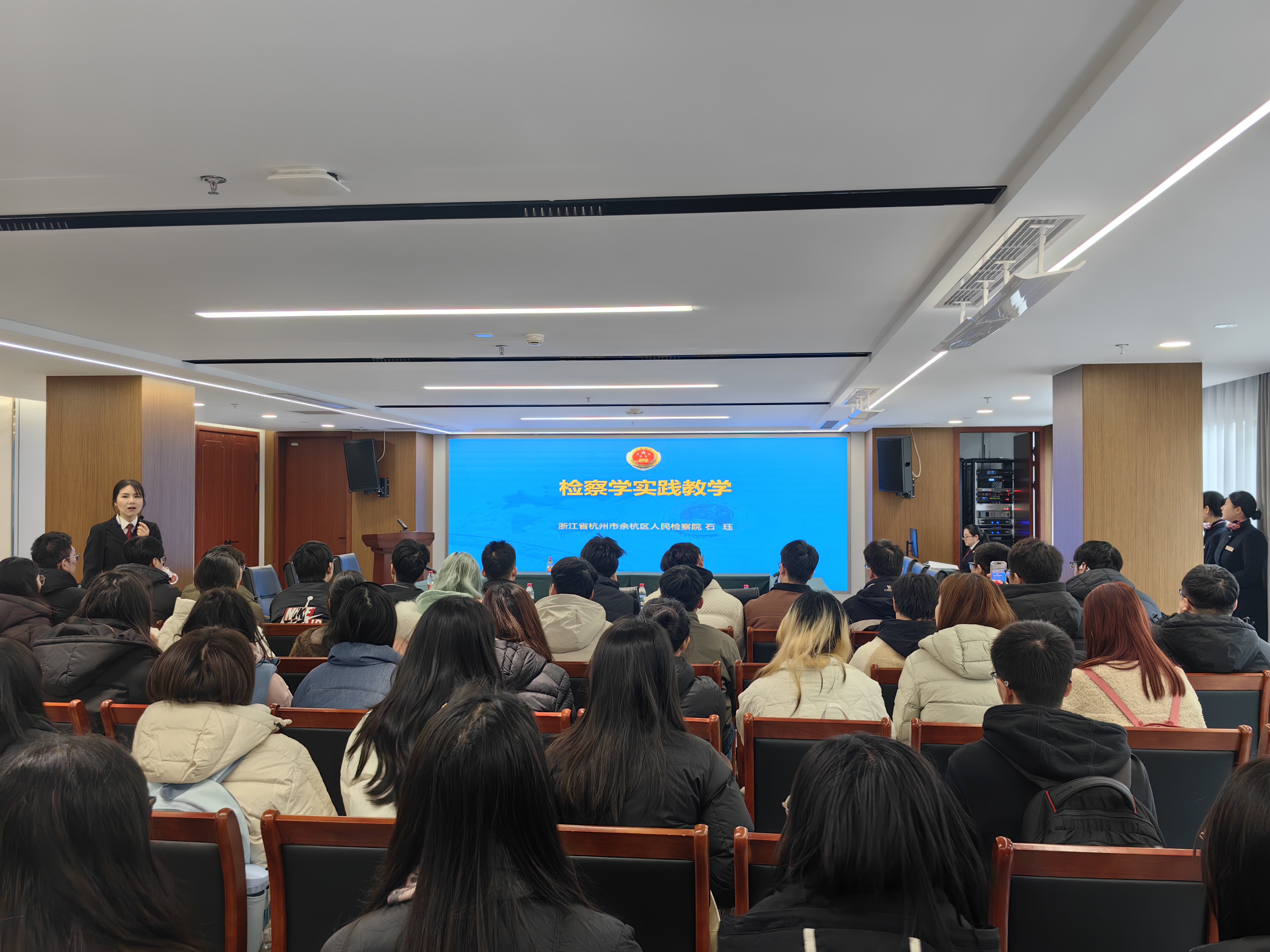 12月30日,在元旦来临之际,我院法学研究生走进浙江省杭州市余杭区人民检察院,开展《检察理论与实务》课程实践教学活动。本次课程以“检察学实践教学”为主题,通过实地参观、现场教学和案例观摩等形式,引导研究生深入了解检察实务运行机制,提升理论联系实际的能力。本次实践教学由余杭区人民检察院石珏检察官主讲,内容分为检察听证与数字检察两个部分。在检察听证教学环节,石珏检察官围绕检察听证制度的核心问题进行系统...